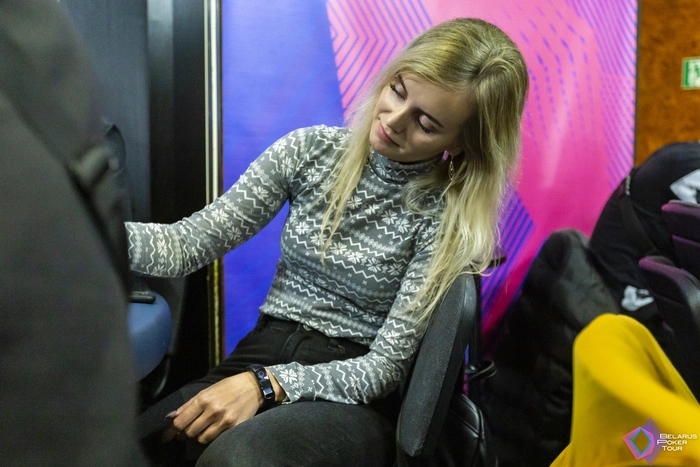 Яна Щербук помогла удвоиться Денису Козлову и сама осталось с 220к. Закрыла олл-ин на большом блайнде с и не обыграла . Перед пересадкой за 2 стола Яна успела один раз поставить олл-ин блайнд в блайнд, но Олег Иванюк закрывать ее не стал.