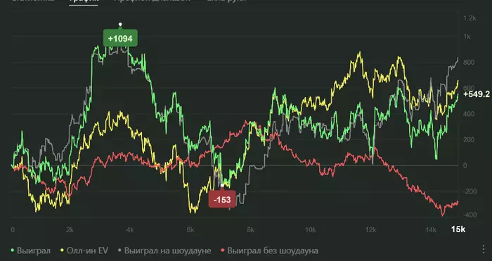 так это два одинаковых графика , один в деньгах другой в бб, почему решил добавить и в бб ,т.к. играл я не только полтос но и 20,даже шотал 100, можете заметить по графикам как после некоторых горок я резко скатываюсь в низ, там я шотал сотку, пока безуспешно, на я заберусь на нее.