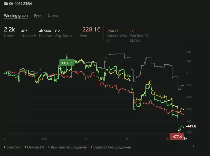 Играл мало, но завтра уже вернусь в привычный график, так что буду давать экшен за столами. Заметил , что сильно изменился эмоционально, стало сложнее себя контролировать и конечно это вылилось в грубые ошибки, вчера заколил овербет пуш от пассивного фиша терне, после чек-чека флопа по второй паре в лимп поте. Такое для меня не характерно. Не осознанное действие, который просто было выплеском.