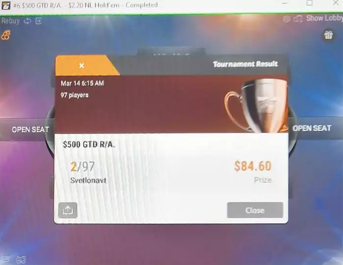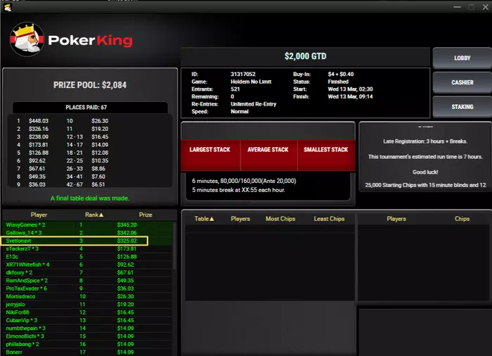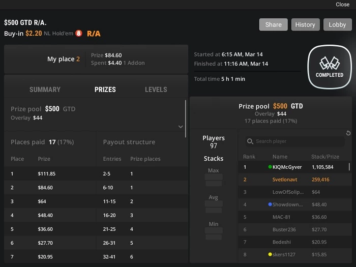 В ТОП-3 поделились, за 12 с лишним часов концентрированной катки я очень устала, оппоненты - реги, стеки примерно одинаковые, разница между первым и третьим в турнире с таким бай-ином для меня ощутима.