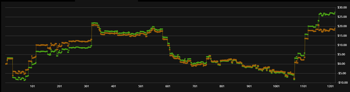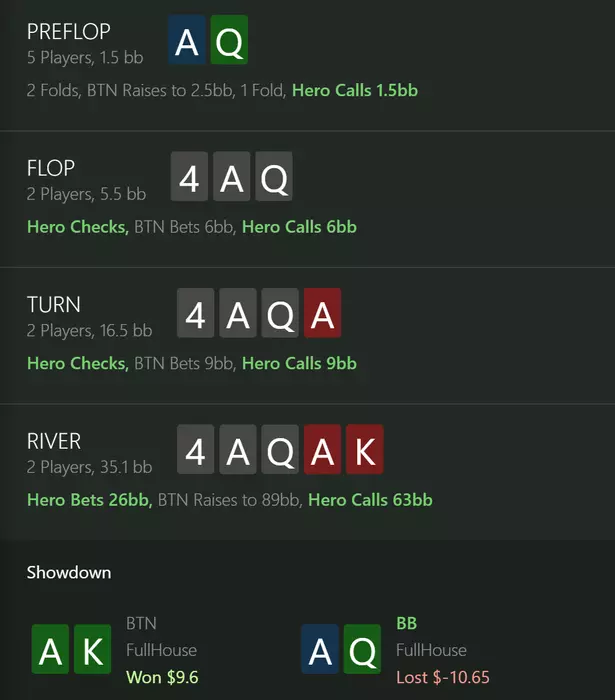 Знаю, что 1.5к раздач это совсем не дистанция и о чем-то говорить рано, но игра намного спокойнее, почти нет сложных решений и маленькими банками график идёт вверх. В конце графика можно заметить резкое падение на 100бб, может показаться, что это ужасный кулер под конец сессии. Это он и есть.