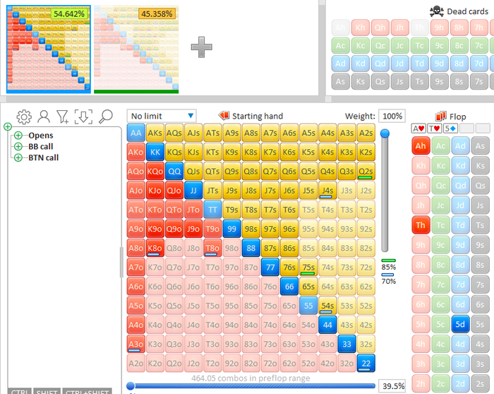 2. Высокие доски. Пример: , , . На таких досках, как рейзер, мы опять же имеем перевес по натсам. Однако из-за дровяной текстуры ставить 1/3 уже себе не можем позволить. Лучшая ставка на такой доске 75%-125%. И диапазон нашего кбета должен быть полярным, чтобы защитить наш бет. Постоянная лупка только на вэлью делает нас читаемыми(Думаю, это имеет место для более высоких лимитов или для румов, где разрешен HUD). На вэлью мы ставим ТПГК, доперы и сэты и хотим получить кол от более слабых топ пар и дров. Для защиты мы наполняем руку блефами, в которые пойду: дрова, слабые и средние пары с хорошим кикиром, двойные бэкдоры и блокеры сильных рук. Например на доске , поставить с будет хорошим решением, так как есть блокеры на AJ. Вот для примера еквити диапазона открытия батона, против диапазона кола ББ: