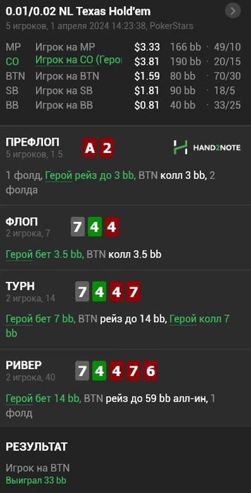 флоп= спаренный борд, с-бет ( ставка в блеф) в надежде опп упадет, заодно пробить его диапозон. опп коллирует. Турн=сет 7 и 2-е 4 ( фулл-хауз), летит чек рейз, я начинаю о чем то нехорошем догадываться))) и когда на ривере закрывается мой флеш ( а такое бывает, когда у оппа фулл-хауз и не иначе, мне моя чуйка сказала==стопэ, коллить олл-ин =преступление против разумного человечества и вся раздача спокойно и без эмоций была скинута в историю))))