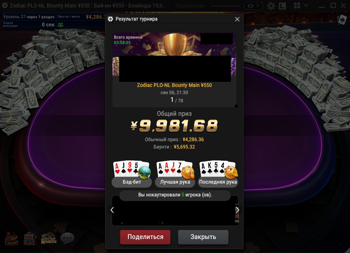 С большим трудом пролез с 25бб до бабла, думал пофолдить до итм (регался в поздней), но самый короткий стек раскрутился до топ 2. Карта не заходила, я дофолдился до 6,63 бб
