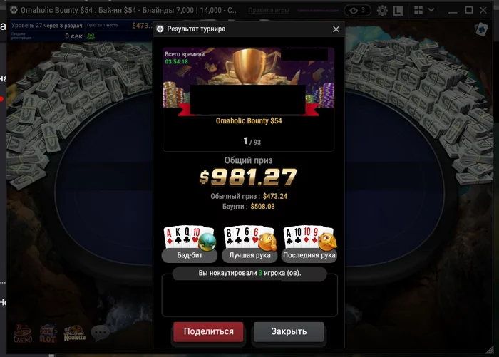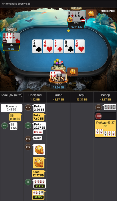 В топ 3 хорошо выставился на ААА8, у соперника на флопе показывало 1 аут на 8 💀