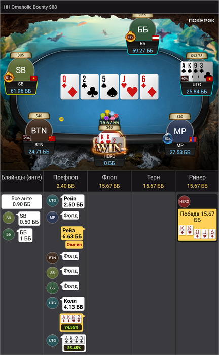 Зашла хорошая рука AK)(K2, повезло выставиться 1 на 1, задоминировать карты оппа и не отлететь от 25,45%: