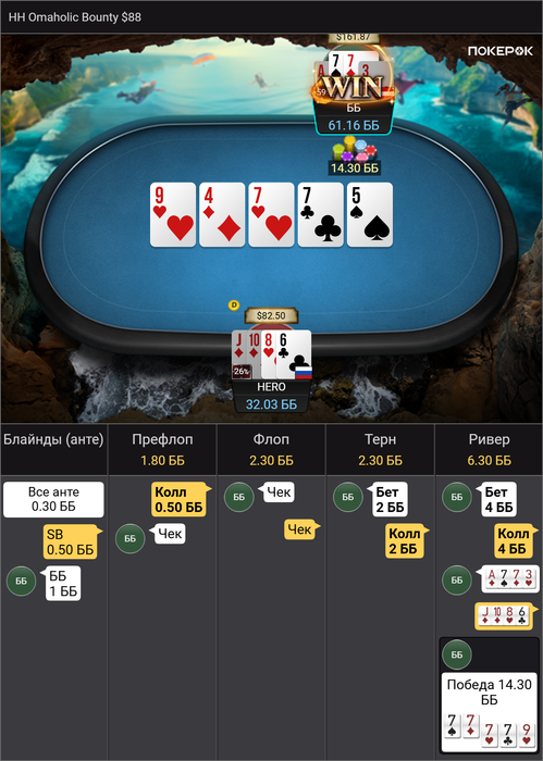 Раздали ему на терне каре 7, а мне на ривере подложили стрит Однако добрал он с меня немного
