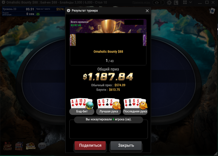 Сегодня все шло по привычному сценарию, отлетал имя 65% на терне, сделал по 3 входа в турниры по 21,6 и 32. Вылетел в турнире по 88, челу закрылось пару аутов. Сделал перерыв на 5 минут (больше турниров не было), зашел второй раз с 60бб.