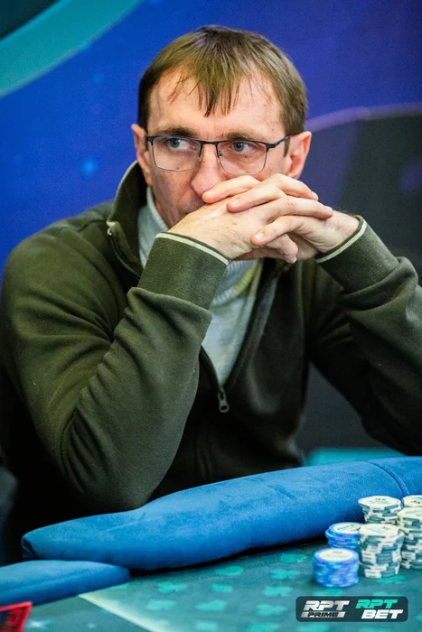 Примерно на 10 минут за 12 столом затянулась одна раздача. Перед этим Виталий Олексин проиграл несколько банков и остался со стеком около 800к. На большом блайнде он защитился против открытия из ранней Александра Каратеева.