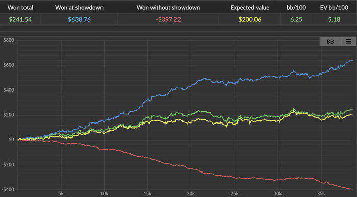 По ев перебрал, но ев на самом деле не совсем объективный показатель, если учитывать кулеры, величину стеков в конкретных раздачах и другие нюансы. В целом, нл10 покерка определенно бьется с рейком. Я планирую откатать еще 40-50к рук на нл10 в апреле, т.к. закрепляю много теоретического материала, а это выгоднее делать дешевле. Так что на нл25 не тороплюсь пока, но и засиживаться на десятке особо не вижу смысла. Как только базу доведу до около машинального уровня, пойду наверх.