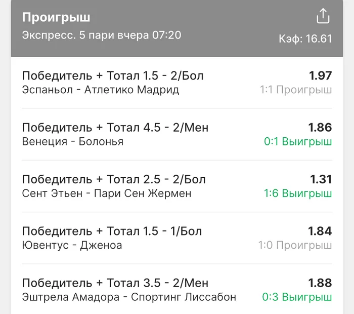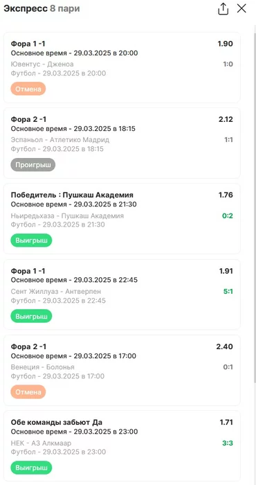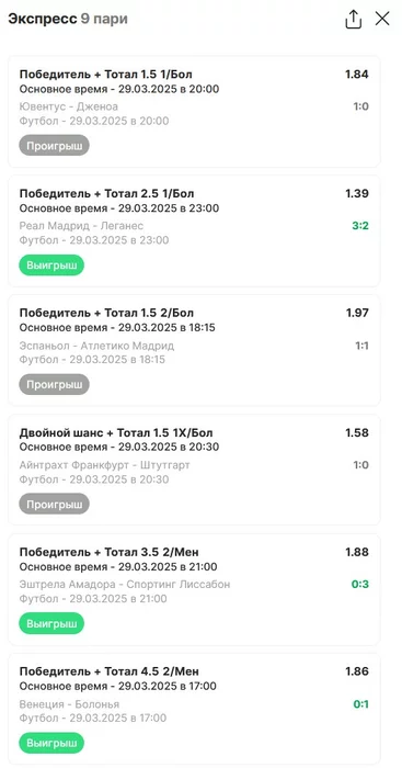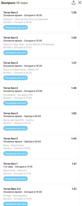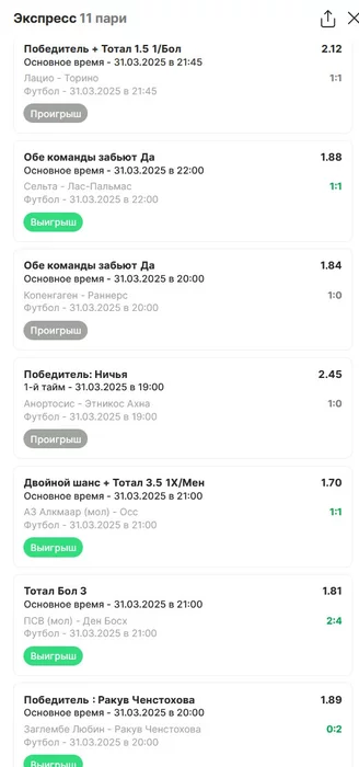 Экспрессы х10+ проиграл Только исх+тотал, 2 выиграло с возвратами, разгоняет их дальше. банк похудел на 20 ₽. Банк -26,04 %.Итого банк 3697 ₽. Экспрессы на 30.03.25. Экспресс 8 -9,6 флета, экспресс исх+тот +4,19 флета, экспресс тотал -э+ 0,18 флета.