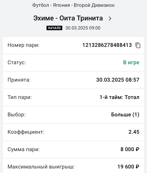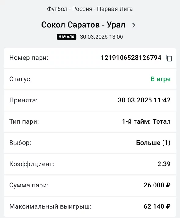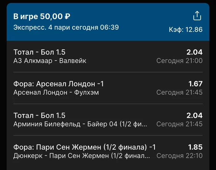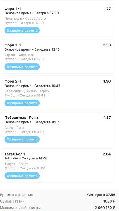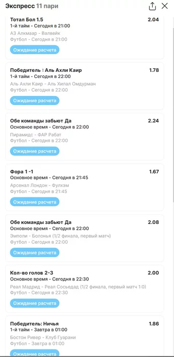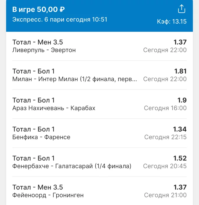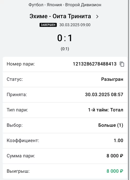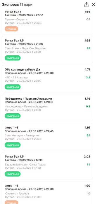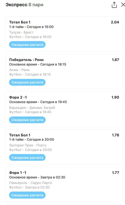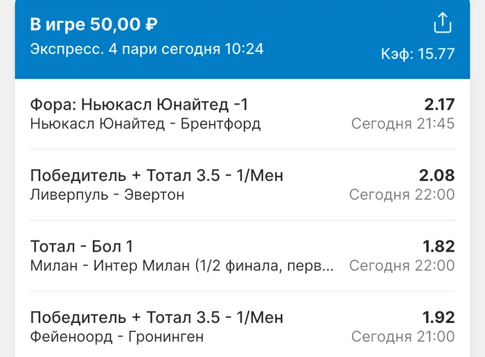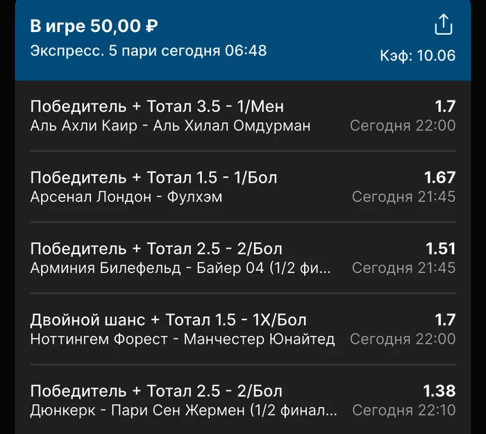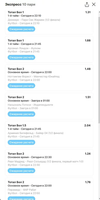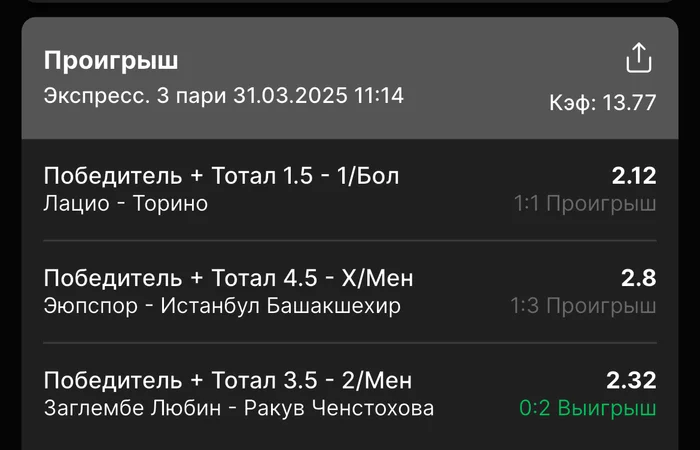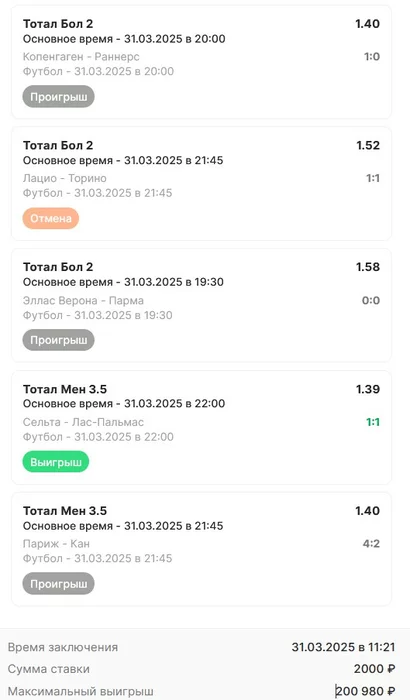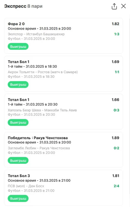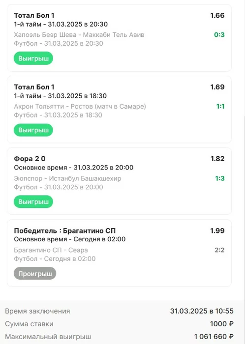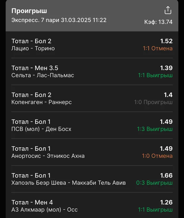 Экспрессы х10+ проиграл Только тотал и экспресс8, 2 выиграло с возвратами, разгоняем их дальше, тот+исх полный выигрыш. банк потолстел на 199 ₽. На скринах суммы 50₽ , но что б не путаться считаю исходя из 20р. Банк -22,44 %.Итого банк 3878 ₽. Экспрессы на 31.03.25. Экспресс 8 -7,54 флета, экспресс исх+тот +7,53 флета, экспресс тотал + 3,22 флета.