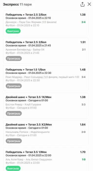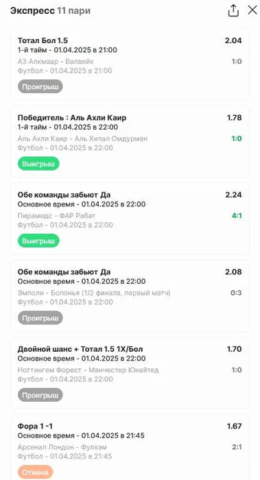 Экспрессы х10+ все проиграли, 3 тотала выиграло с возвратами, разгоняем их дальше. банк похудел на 40 ₽. На скринах суммы 50₽ , но что б не путаться считаю исходя из 20р. Банк -24,44 %.Итого банк 3778 ₽. Экспрессы на 02.04.25. Экспресс 8 -7,13 флета, экспресс исх+тот +6,6 флета, экспресс тотал + 5,63 флета.