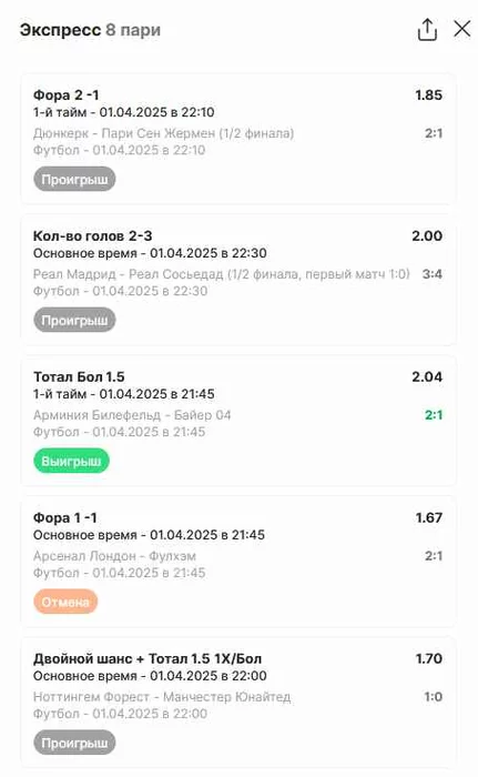 Проигрыш всех экспрессов 01.04.25 - 6 000 р, по догонам матчей не было. Прибыль за год по экспрессам -128 200р, за апрель -6 000 р. По догонам с начала года наша прибыль составляет 190 350 р, за апрель по сегодняшний день по догонам наша прибыль составляет 0 р. Таким образом с начала года наша общая прибыль + 91 964 р, прибыль за апрель -6000 р! Экспрессы на сегодня 02.04.25. Все желающие велком в чат, читайте закрепы. https://t.me/PR0rN0ZbI_HA_FYTB0L