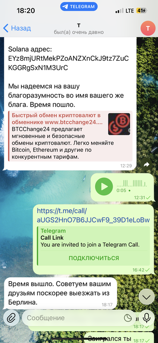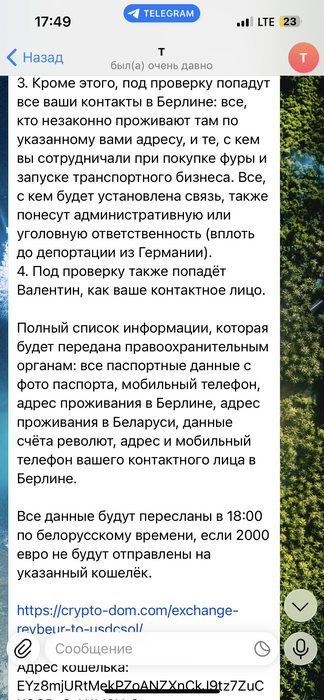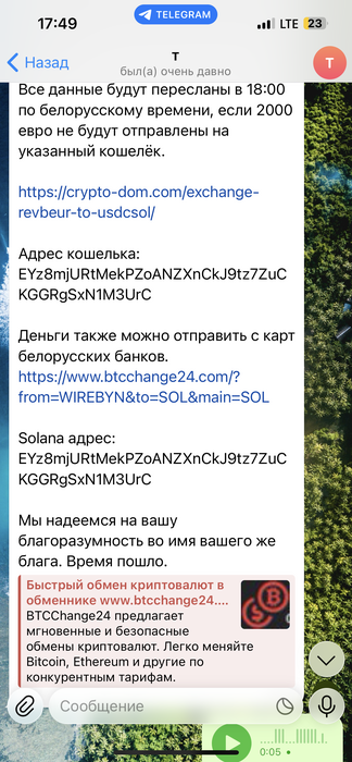 в тг если пишет"был очень давно"значит тебя или забанили, или акк удален. если кошельки его, то тебя кинули и еще хотели развести хотя бы на 2000 евро, понял что денег не будет и заблокировал..