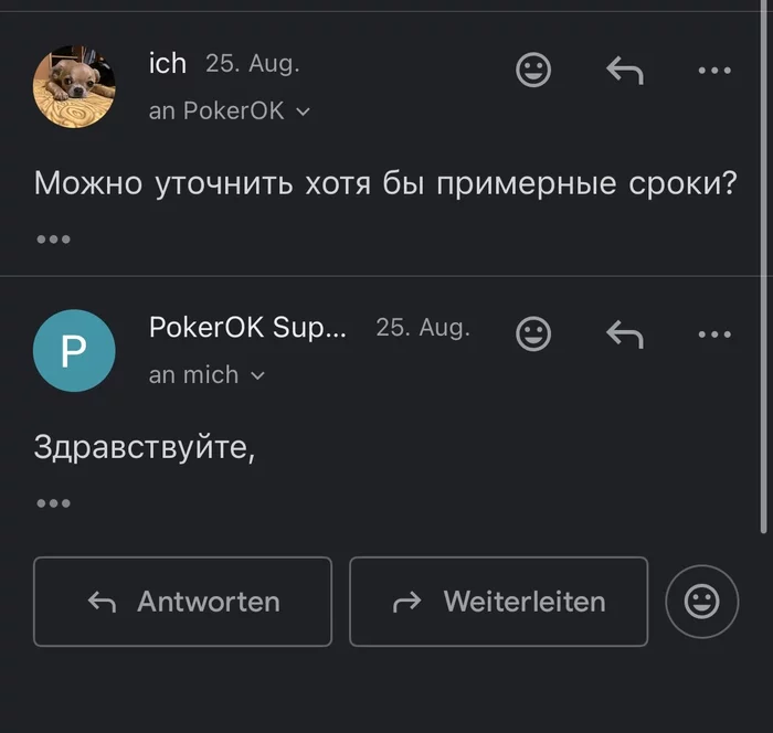 TeRmik_T2o15, А чего ждать то? Они уже давно хуй забили, а скорее всего намерено бабки спиздили и это конец истории. Ответ давать им нахуй не надо, он явно будет ебанутым, ещё больше внимания могут привлечь. А так проверка. Не спиздили деньги, не бан за порчу покерной экологии, не за использование впн, я хз что они кщё придумать могут. А «временная проверка». Звучит не так страшно
