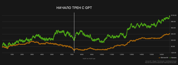 В прошлый раз мы договорились с чатом GPT о том, что я наигрываю 5К рук и снимаю контрольные метрики на отрезках по 1К. Для тех, кто не хочет читать много букв, кратко скажу так: по ходу этой дистанции нас накрыло стриком, и мы улетели в минус 35 БИ на промежутке 1000–3000 рук. Мы забуксовали по EV, попав в сильный состав, и если по графику это не особо заметно, то по факту наша игра «в ноль» напоминала анекдот про двух ковбоев, которые поели говна и заплатили за это налог.)