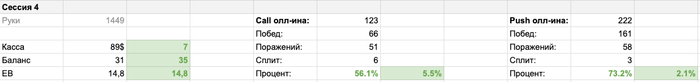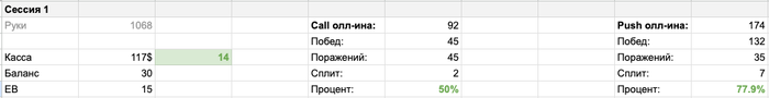 Первая сессия сложилась очень позитивно: мы плюсанули 14 БИ и просто великолепно показали себя в пуш-винрейтах. Офк, он не весь состоит из выигранных выставлений – где-то мы просто забирали блайнды. Винрейт колла – 50%, тоже неплохо, но можно улучшить.