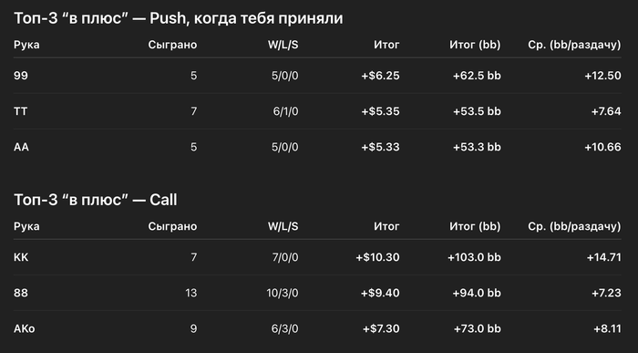 1. Процент побед ≠ деньги. Можно иметь 70%+ win по PUSH и всё равно не зарабатывать, так как большинство винрейта тут – блайнды.