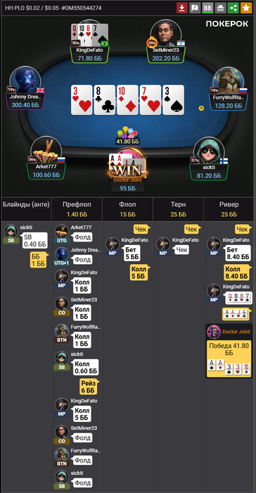 Единственное, он почти перестал со мной большие банки разыгрывать. Запихнуться может на шару в 3-бет поте на флопе, если куда-то отдалённо попал, а так уже кнопку фолд в ха банках чаще нажимает. Хотя, в целом, своему стилю не изменяет за столом. Там иногда он и jpaulomuts кубок лобби по страдлам разыгрывают. А так как играют они обычно по 6-9 столов, то страдлодискотека может быть почти на каждом столе.
