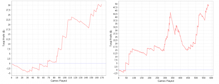 Тут нельзя оценивать абсолютный профит, который на начальном этапе естественно будет незначительным по сравнению с конечным результатом. Важно то, что стартовый банкролл пока успешно увеличивается в разы. Мы имеем дело с геометрической прогрессией, главное, чтобы не стриковало в момент перехода на новый лимит.