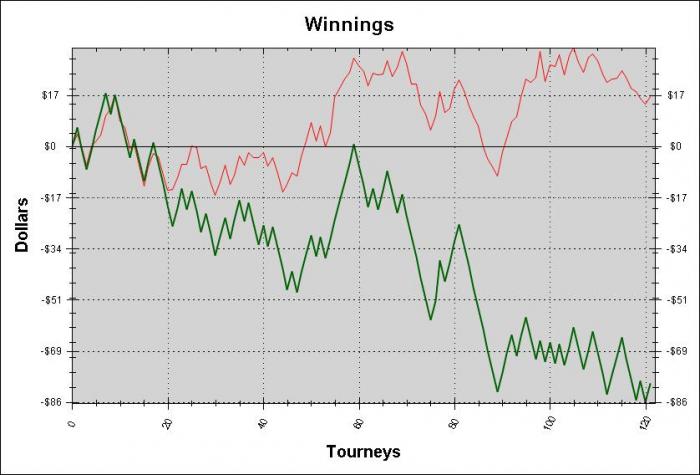 Смысл даунстрика заключается по моим наблюдения в ужасающей частоте ловли в 3бет потах на пол стека натсы с говноруками по типу Q4, 62, 85 и радующих моих соперников чудо-риверах и раннер разнообразных комбинаций. И на первый взгляд секрет в ха снг очень прост, в периоды даунов проигрывать меньше, а в период апов выигрывать больше, но не все так просто. Просто надо научиться сбрасывать старшие фуллхаусы в такие периоды, потому что там карэ в 99% случаев. Еще одня особенность тильта это мегадисперсионная игра. Я начинаю играть как бэ в супер турбо только при стеках >50бб. Весело, но не прибыльно.