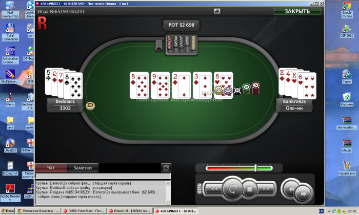 Игра PokerStars #65194165231: Турнир №420149653, $28.78+$1.22 USD Омаха Пот-лимит - Раунд матча I, уровень I (10/20) - 28.07.2011 13:00:43 ВВ Стол '420149653 1' 2-max Баттон на месте №2 Место 1: Bankroll2s (1349) Место 2: BeddiacE (1651) BeddiacE: ставит малый блайнд 10 Bankroll2s: ставит большой блайнд 20 *** ЗАКРЫТЫЕ КАРТЫ *** Карты Bankroll2s [Kd 4d Kh 6h] BeddiacE: делает рейз 40 60 Bankroll2s: делает рейз 120 180 BeddiacE: делает колл 120 *** ФЛОП *** [8d 9d 2d] Bankroll2s: делает чек BeddiacE: делает чек *** ТЕРН *** [8d 9d 2d] [3d] Bankroll2s: делает чек BeddiacE: делает чек *** РИВЕР *** [8d 9d 2d 3d] [8h] Bankroll2s: делает чек BeddiacE: делает бет 284 Bankroll2s: делает рейз 885 1169 и олл-ин BeddiacE: делает колл 885 *** ВСКРЫТИЕ КАРТ *** Bankroll2s: открывает [Kd 4d Kh 6h] (флеш [старшая карта король]) BeddiacE: открывает [5c Qd 7h 8s] (тройку [восьмерки]) Bankroll2s получил 2698 из банка *** ИТОГ *** Общий банк 2698 | Доля 0 Борд [8d 9d 2d 3d 8h] Место 1: Bankroll2s (большой блайнд) открыл [Kd 4d Kh 6h] и выиграл (2698) , собрав флеш [старшая карта король] Место 2: BeddiacE (баттон) (малый блайнд) открыл [5c Qd 7h 8s] и проиграл , собрав тройку [восьмерки]