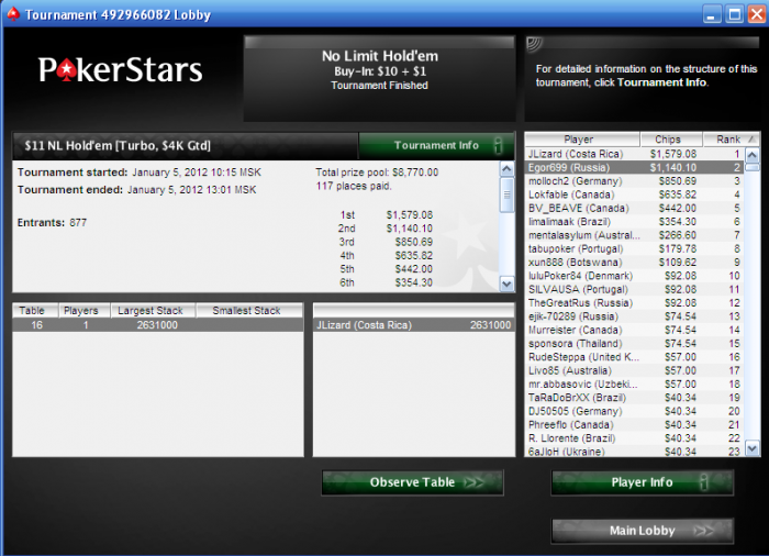 Я мазохист что ли блеа... После 1.5 часов игры, обменяв всего 1К рублей, шел где-то в +10К, все было отлично, но хотелось еще поиграть, поэтому не стал уходить. И тут понеслось... Раз за разом проигрывая олл-ины и крупные банки, растерял свой стэк, и пошли докупки, наменял 20К в итоге, и я понял, что быстро уйти не удастся. Шла тягучая игра, народ уходил, одно время играли 3макс в течение часа, наверное. И часов в 10 утра началось. Такого я еще не видел, руки заходили одна за другой, тузы зашли в течение двух часов раз 6-8, карманки попадали в сеты и так далее... В общем, к 12 дня мой стэк составлял больше 20К, не отсчитывая точно, дал на чай дилеру, и с плюсом в 100 рублей, поехал отсыпаться...)