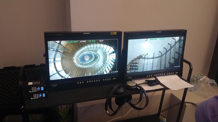 Мониторы стоят около 7к$ за штуку. Поэтому их лучше не носить долго в руках, а каждый раз убирать и перетаскивать в огромных кофрах, разбирать обратно, устанавливать и тянуть кабели к камерам так, чтобы они нигде не попадали в кадр. И еще горилла-тейпом кабели закрепить, чтобы о них никто не споткнулся и не разбил что-нибудь из не менее дешевого киношного оборудования.
