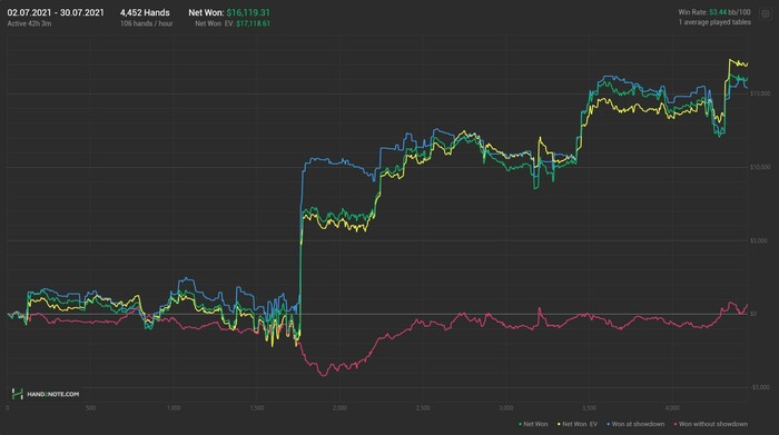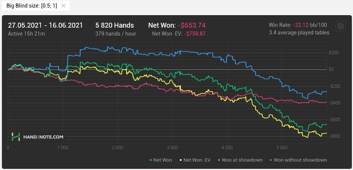Забавно, что весь залив произошел в 3бет и 4бет потах в качестве как агрессора, так и коллера... и при этом эту часть стратегии, как раз не менял вообще.