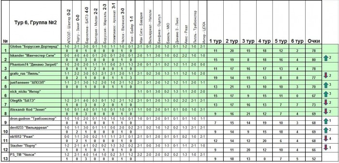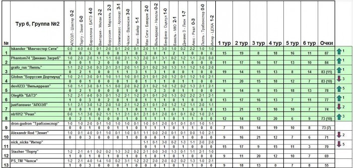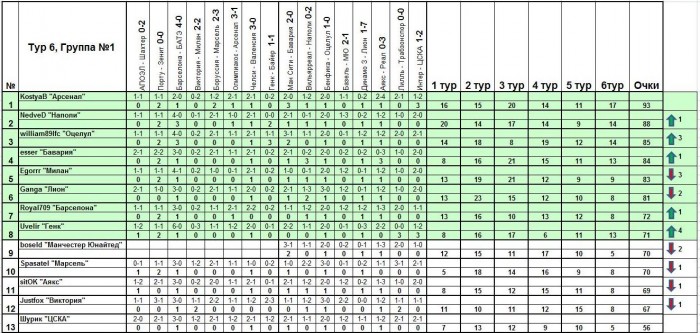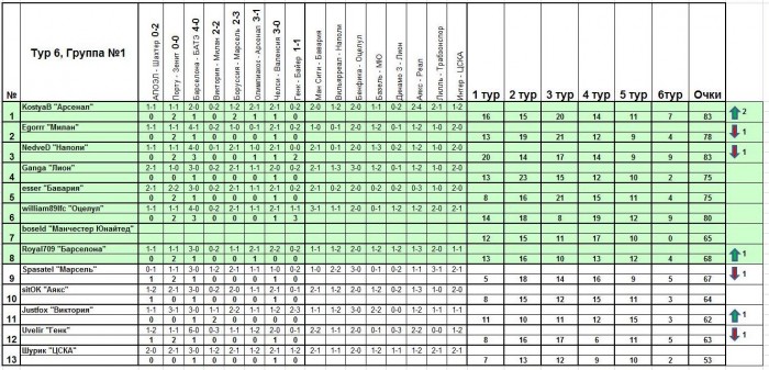 После 6 туров!Группа №1:В первой группе изменения в последнем туре оказались не значительными. Самый большой рывок сделал Uvelir, и пробился в весеннюю стадию. Ну, с его-то везением =)