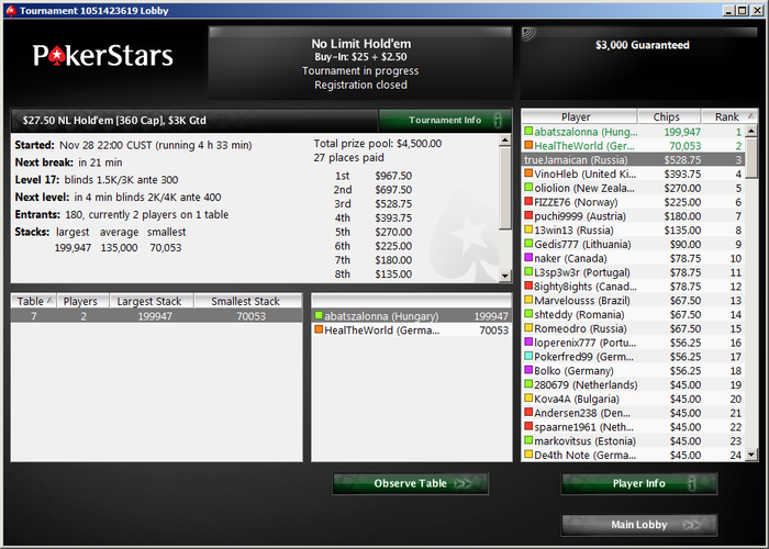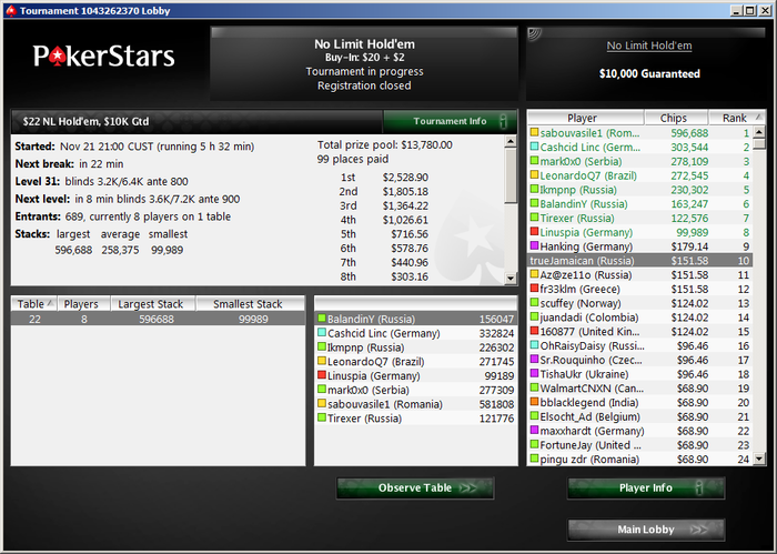 Poker Stars, $10 Buy-in (400/800 blinds, 100 ante) No Limit Hold'em Tournament, 9 Players