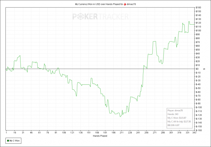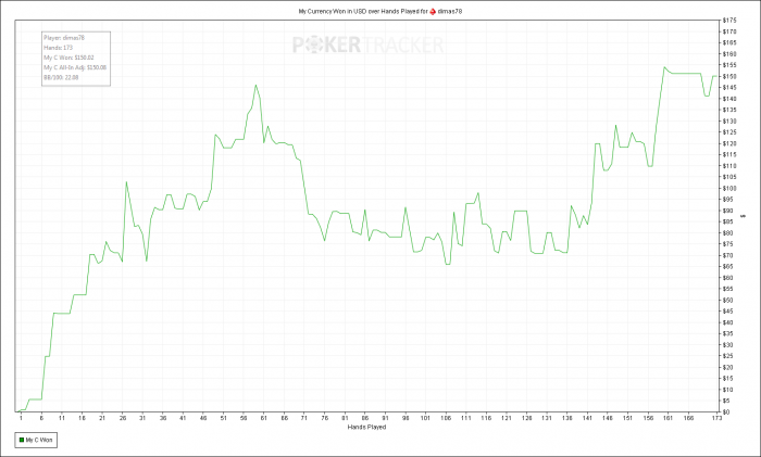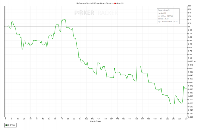 Поставил галочки играть до блайндов, пока ушел в ситаут, успел немного отыграться и выйти из -$200, но кулдаун есть кулдаун! Я не отсаживаюсь сразу по достижении стоплосса, потому что играть со свободных позиций всегда плюсово, но это не повод нарушать внутренний контракт.