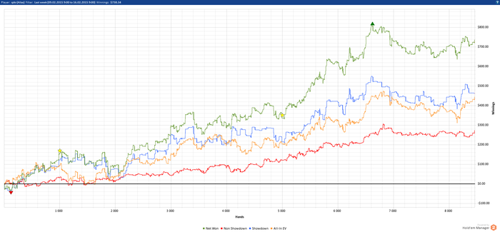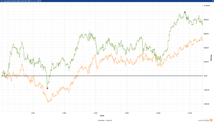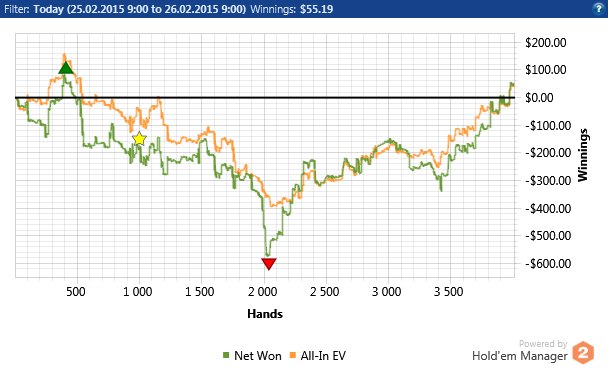 Со среды играю 50. Там тяжелее в том плане, что количественное соотношение реги/фиши гораздо выше, чем на 25. А реги 50, к слову, разные: есть сильные, есть и средние (к коим сейчас отношу себя), есть и откровенно слабые. Похоже, что играю в 0 на лимите. Задача на следующую неделю - сыграть в + по ев. Ну и желательно по факту
