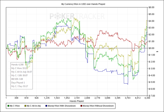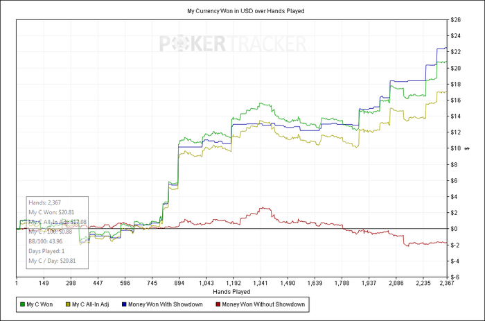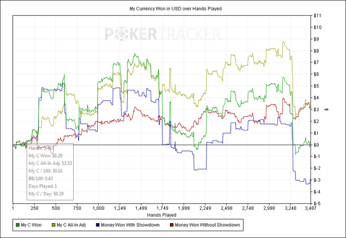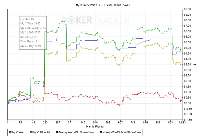SB: 107 BB (VPIP: 16.47, PFR: 9.41, 3Bet Preflop: 5.71, Hands: 86)