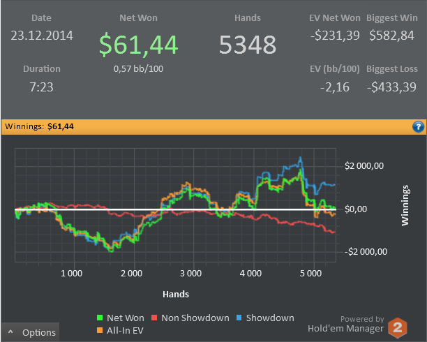 FlySoHigh @ 23.12.2014 Вторая и особенно третья раздача - довольно специфичны. Какие были нотсы, что так сыграл? Или это было "в динамике, по замазке"?