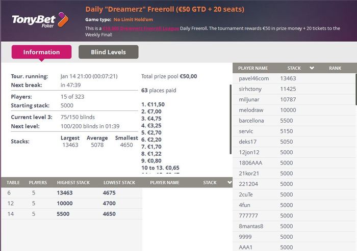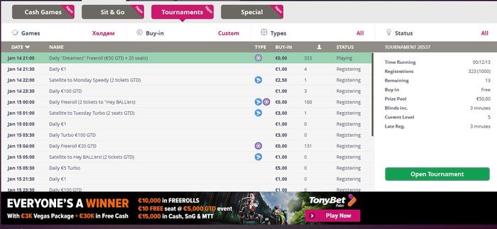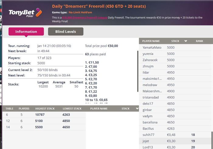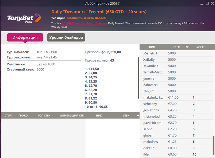 . Зарегистрировался в этот "турнир", во-первых:турнир не открывается во время старта т.е. окно стола не открывается, во-вторых 323 человека турнир, а прошел он ровно за 45 минут, и в-третьих его как бы и не было, а призы раздали, это тем кто первым зарегистрировался или это просто все ваши "люди", интересно призы раздали, а у всех остальных стеки указаны стартовые. можете объяснить что это за турнир такой. Людей заманили к себе с помощью сайта,а наладить софт не получается или как Вы это объясните