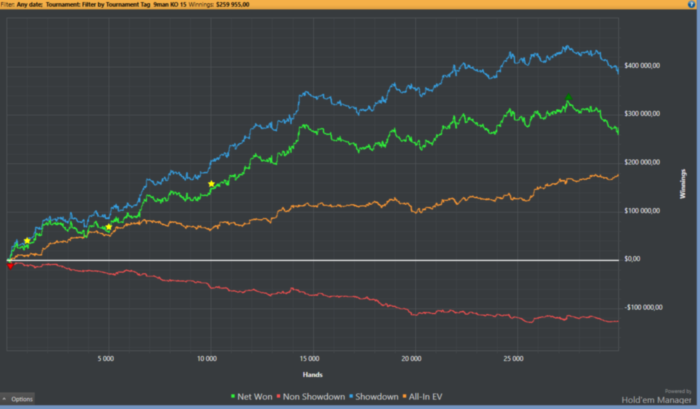 Теперь смотрим: банк на флопе составляет 4370 фишек. То есть по сути мы выставились префлоп алл ин имея 52% на победу против двоих. Следовательно, линия EV, совершая данное действия, должно дико расти.