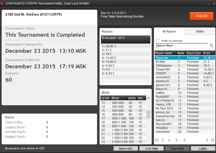 Party, $2 Buy-in (600/1,200 blinds, 120 ante) No Limit Hold'em Tournament, 8 Players