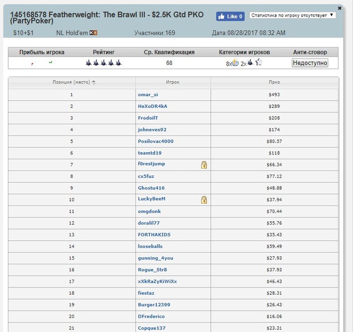 Категория Low:13:00 $5.5 Featherweight: $1K GTD Freezeout