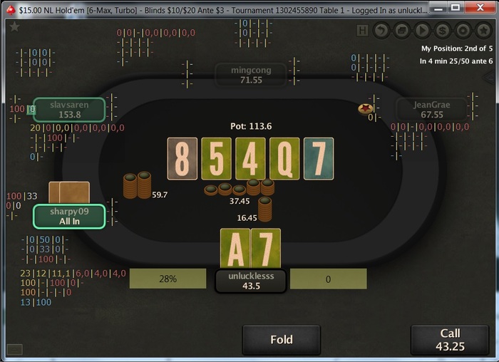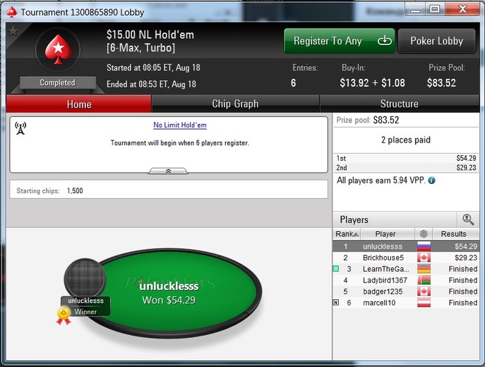 Poker Stars $13.92+$1.08 No Limit Hold'em Tournament - t15/t30 Blinds + t4 - 5 players