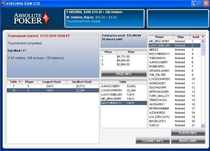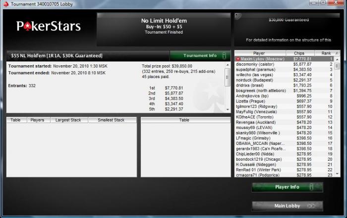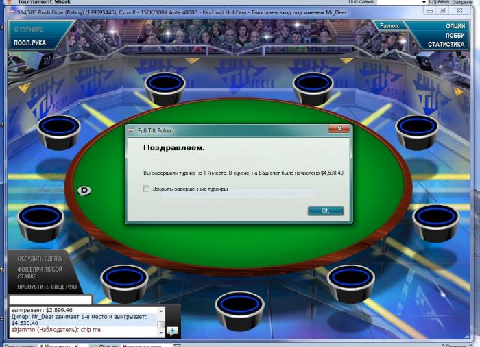 У меня за сегодня уже полуфинал в гипер-турбо-ХА турнире за $102 (около $1350) и топ-1 в турбинке за $109 (около $4600)... вот что значит решил график поменять и не спать весь день после бессонной ночи. :)) Окупается!)