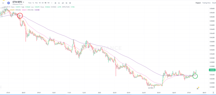 Пару дней назад поступил сигнал, который я считаю, означает смену глобального тренда по этой паре ETH / BTC (на рисунке обозначен зеленым кружком). Я для верности дождался обновления предыдущего хая 0,02624 (пробитие горизонтальной линии на первом рисунке).