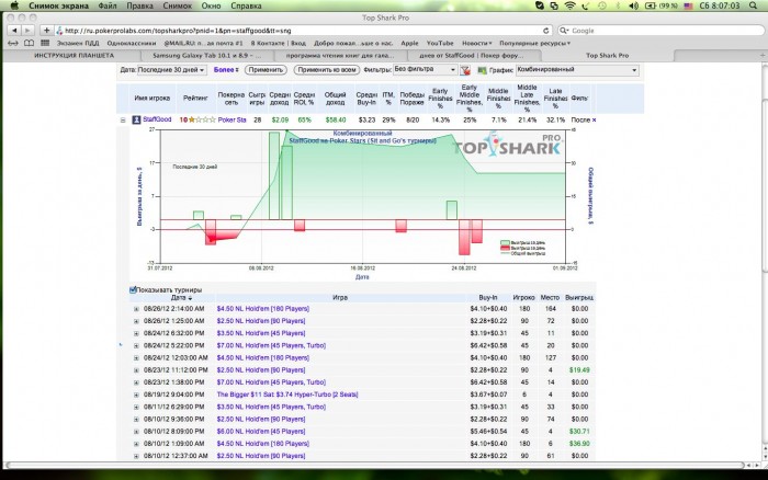 Всех с Днем знаний и наступлением осени! Результаты за июль в снгшке в графике. Плюсанул мало, много сил забрал оф. Был и Крым, и Харьков, и занятия в школе покера. В целом 30 июля подловил себя на состоянии счастья, оно у меня бывает редко, раз на 7/12 лет. Сын стал студентом и будет учиться в одном из лучших Вузов Украины, 3 Нобелевских лауреата выпустило заведение. Нет, мы не ставим перед собой таких высоких целей, нам достаточно малого. Теперь бы он мои старания подкрепил своими и будет очень здорово. Забавное обстоятельство обнаружилось: дети насмотревшись "Универа" прут в общагу не стесняясь обшарпанных стен, сквозняков, общего туалета и прочих сопутствующих "радостей" студенческого быта Сыну снова повезло! Его поселили не в чисто мужскую общагу, а в соляночку, в которой процентов 85 прекрасной половины. Думаю дальше все в его руках. Супруге на ДР купил Galaxy Tab 2 5100 10", приятный дивайс, она с ним разбирается, "вынося" простыми вопросами мозг мне. Но в целом умница, вопросов становится все меньше. Фух