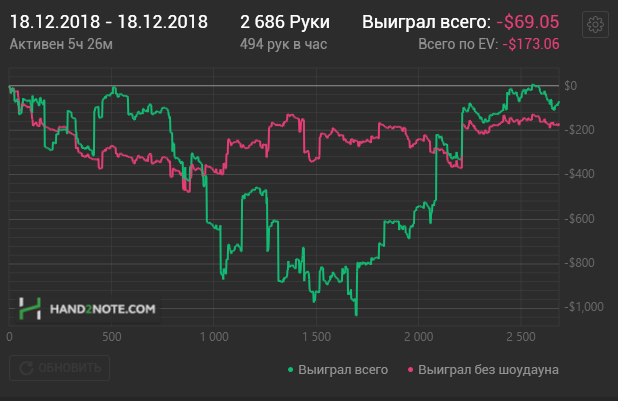 Сегодня забавно получилось. Значит первая сессия такая боевая. Лил 3 стэка, но сохранял концентрацию, играл в целом хорошо и т.д. Потом вышел в плюс но почувствовал что устаю и решил сделать перерыв, даже ушел с хороших столов, что для меня редкость.
