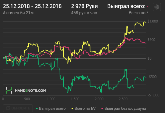Такая ежедневная игра погружает в покер с головой. Было прикольно прямо на глазах прогрессировать как в технической, так и психологической составляющей. Результатом доволен, тем более что перебрал по ЕВ. Плюс всякие бонусы на первый деп, релоад, сам РБ и тд - в итоге вышло в районе 9к.