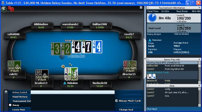Вот, например раздача, где я мог поправить свои дела и даже выйти в плюс в "последней" сессии. Имея всего лишь минус 200$ по сессии, я с