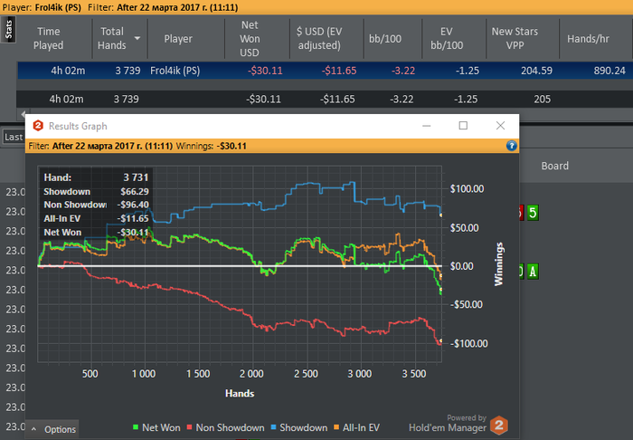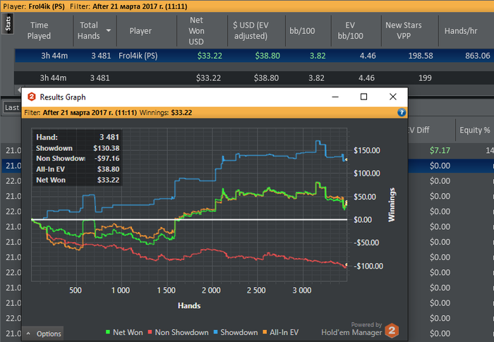 23е. Последний отчет. После 2.8к рук у меня +15$~ и +60$ по ев. И красная линия в нуле!! Какой ев бб? 8 ев бб было!!! 8 сука нахуй бб!!!