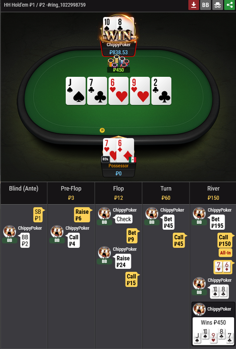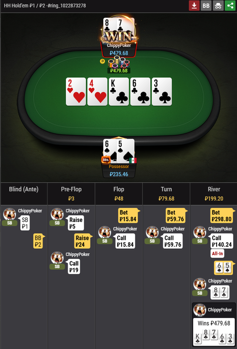 всю дорогу не складывалось, оппонент постоянно переезжал ривером, но я сделал 2 шикарных паса, одну крупную ошибку в последней раздаче с но уже концентрацию упала до нуля поэтому прощу себя за нее.