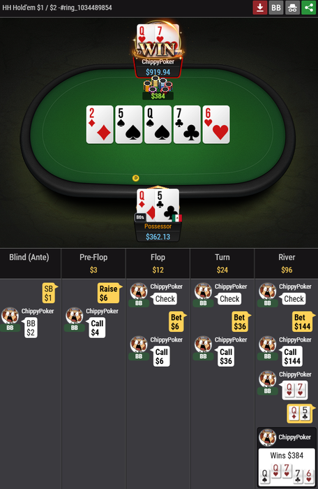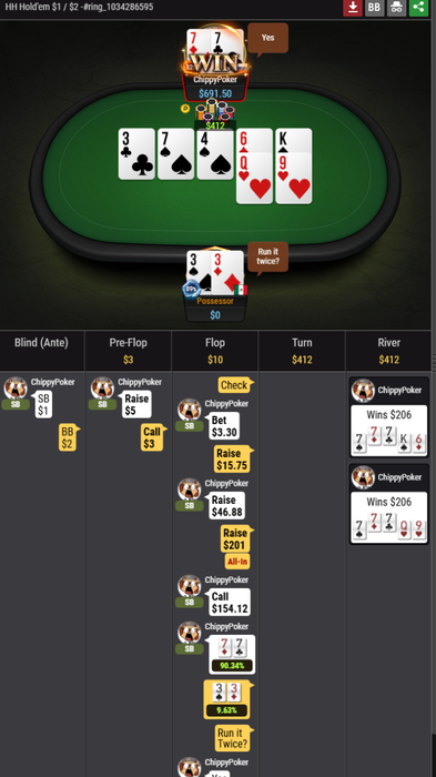 тут флоп и терн точно кол, ривер можно отбивать, можно выкинуть, оп переблефовывал в чек рейзах, я решил отбить так как 2 пары старше он не пушит, сеты я блочу, получается либо блефы, у него не только через 10 а любой воздух, либо стрит, в этот раз оказался стрит.